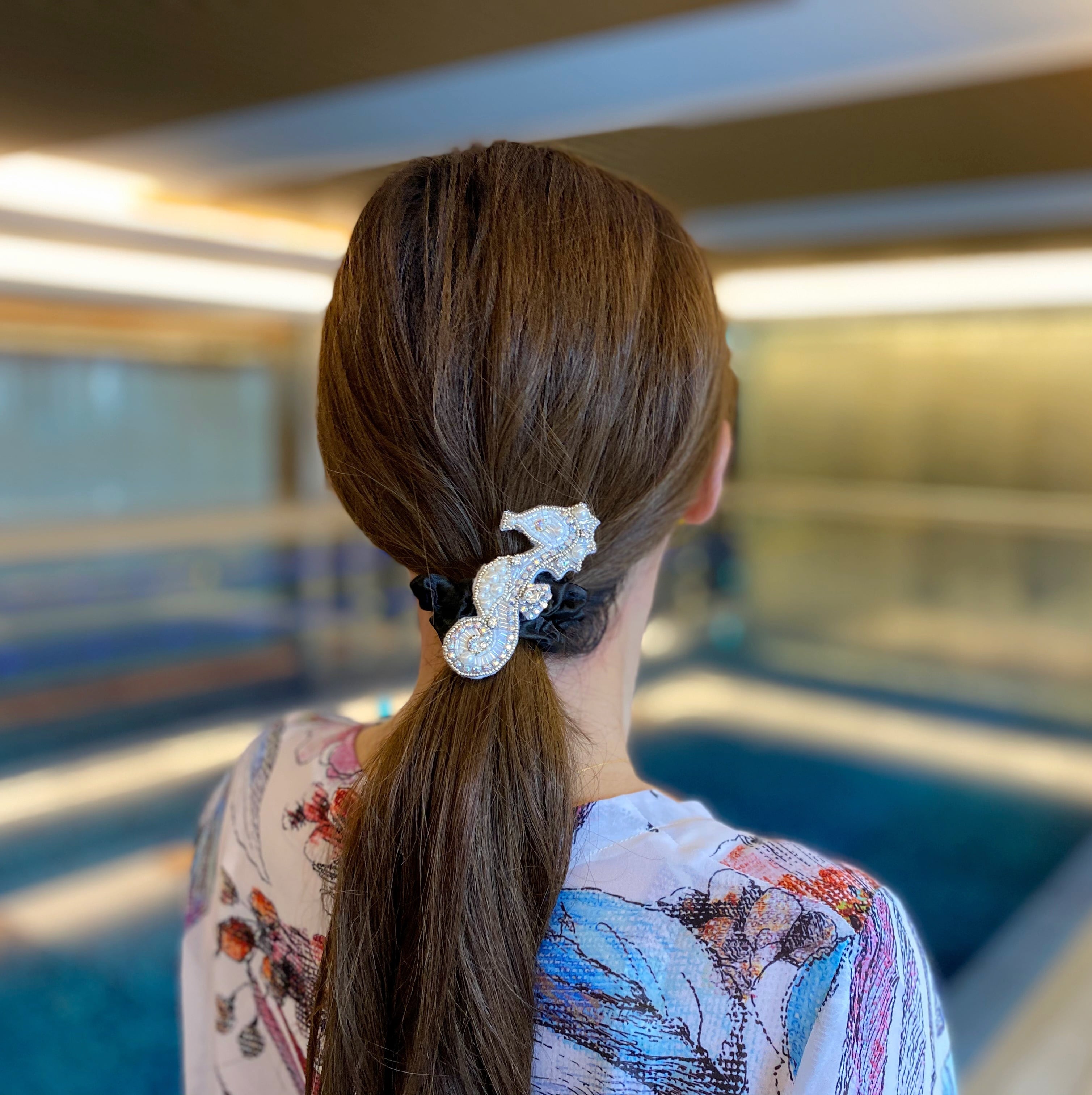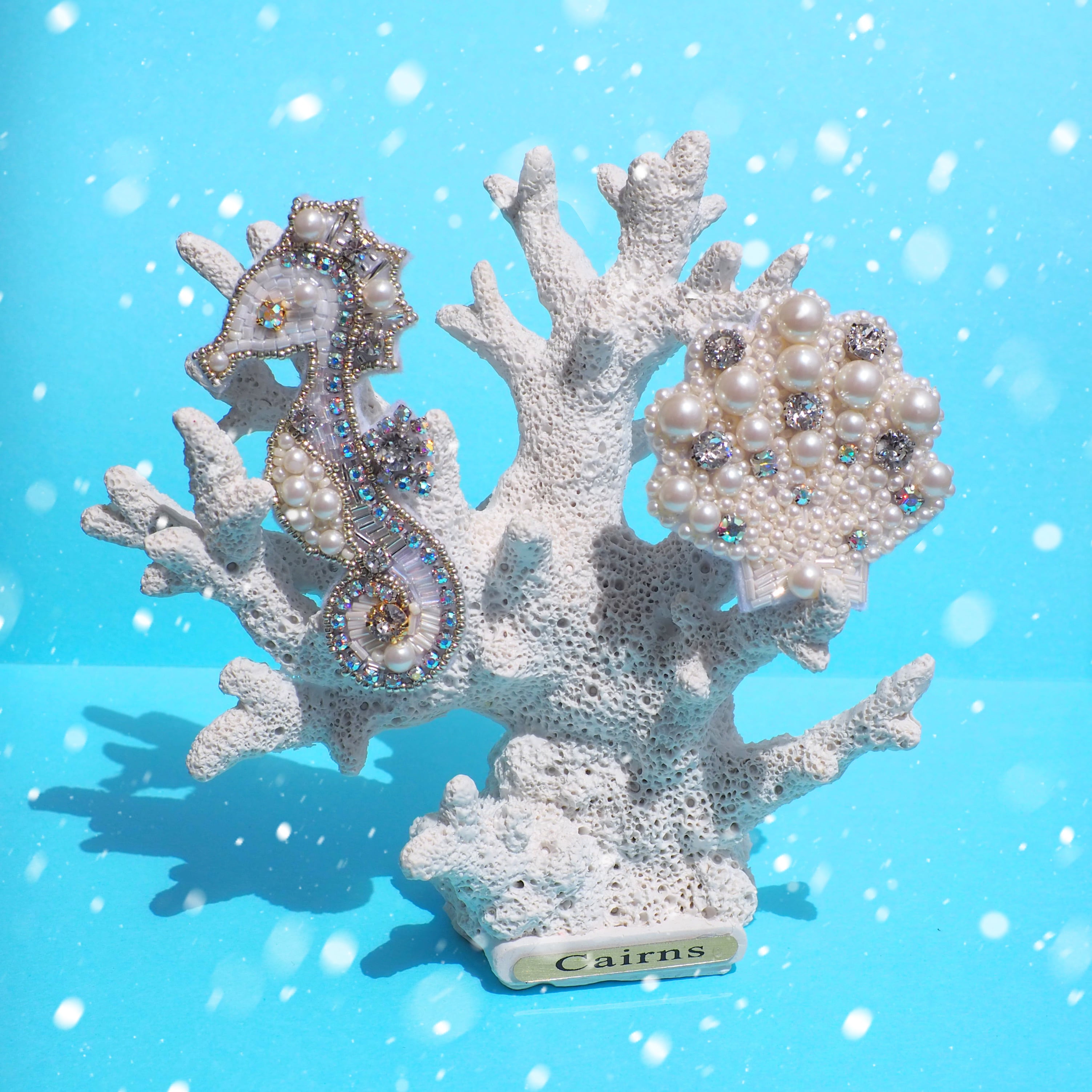 様々なビーズ、スワロフスキーをギュッと詰め込んだタツノオトシゴモチーフ
